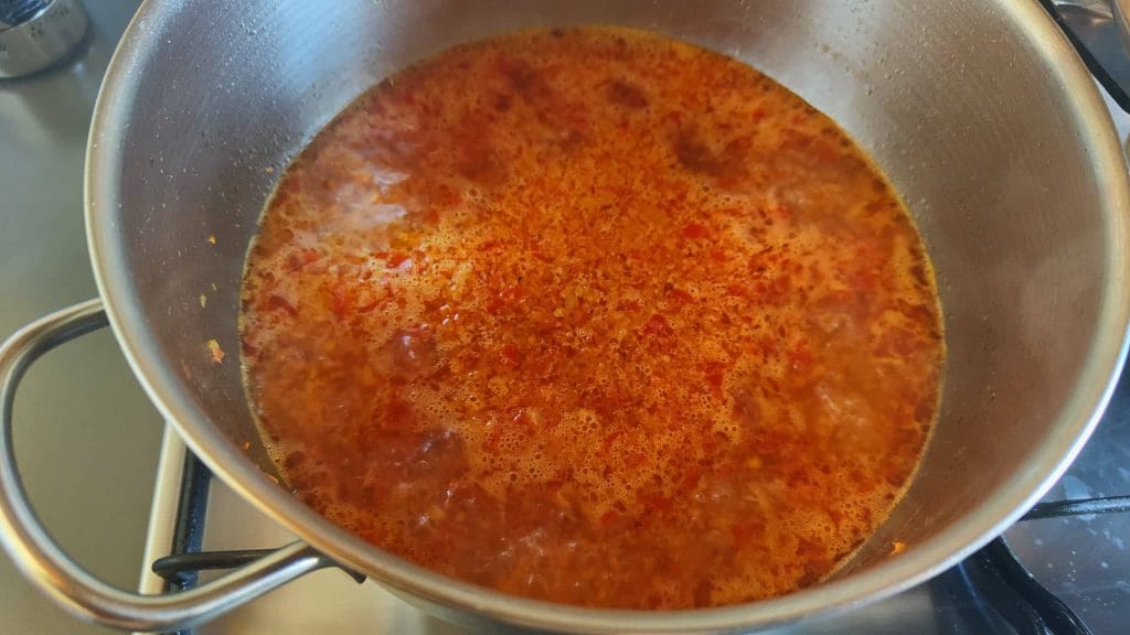 Ich habe die geschälten Tomaten mit einer Gabel zerdrückt, sie in den Topf gegeben und gut durchmischen lassen.
