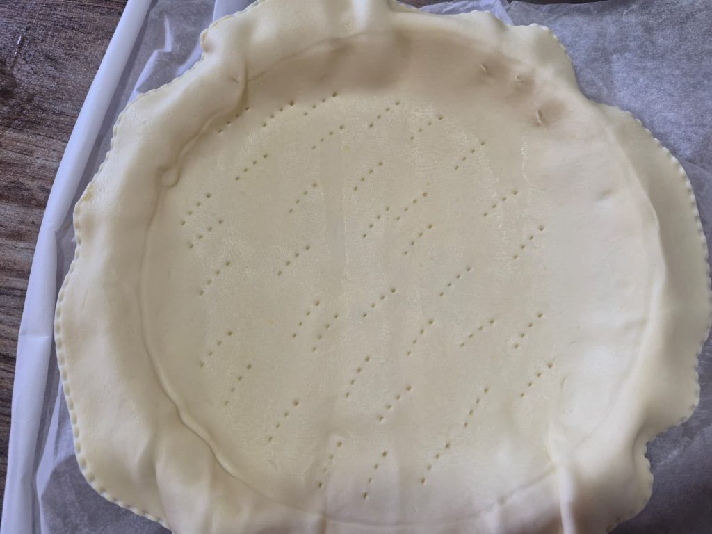 Die Streifen auf der Torte kreuzweise anordnen, genau wie bei einer süßen Tarte, um das klassische Rautenmuster zu erzeugen, das auf meinem Foto zu sehen ist. Die Ränder nach innen falten und gut versiegeln.