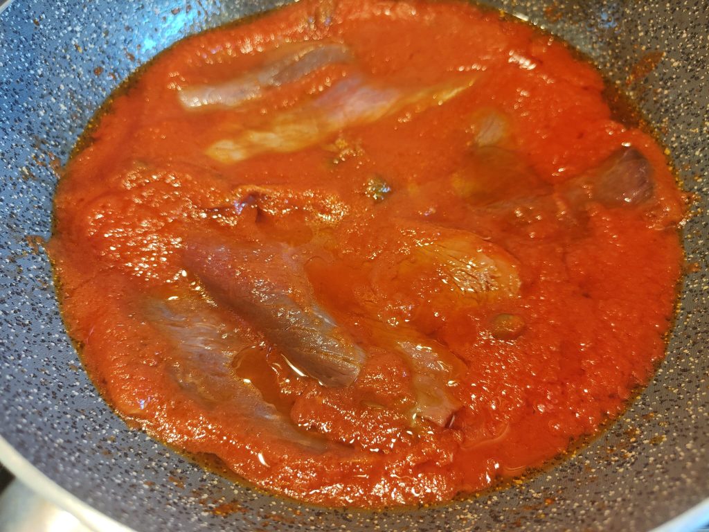 Man beginnt damit, das Öl mit den Gewürzen zu aromatisieren, dann wird das Tomatenpüree etwa zehn Minuten gekocht. An diesem Punkt wird das Fleisch direkt in die kochende Sauce gegeben. Nichts einfacher als das.