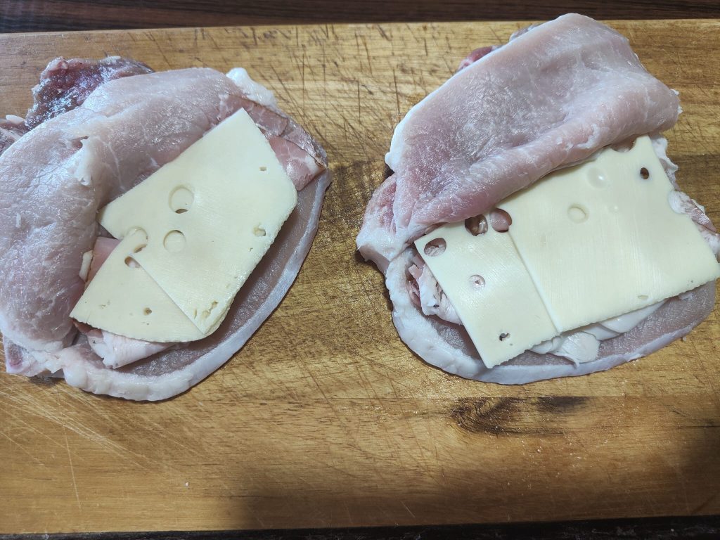 Die doppelte Panade verleiht den Schweinesteaks eine knusprige und goldene Kruste und verhindert, dass die Füllung während des Kochens austritt.