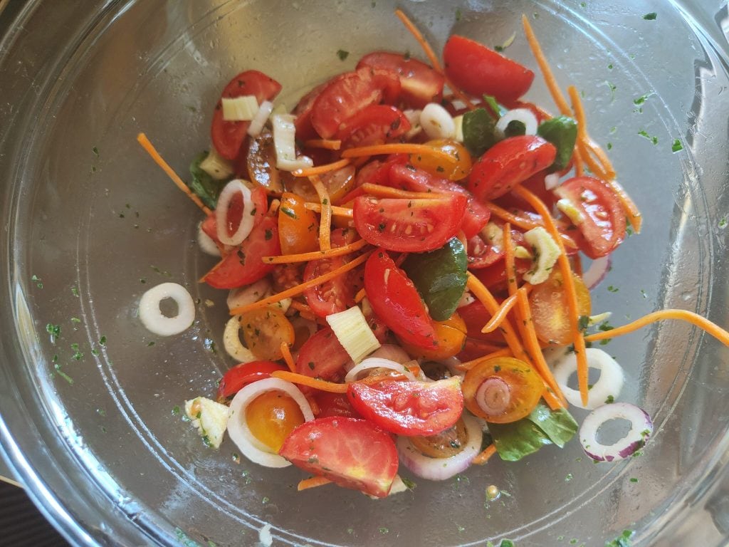 Wir können es nämlich im Voraus zubereiten und im Kühlschrank aufbewahren. So wird der Salat noch schmackhafter und ausgewogener.