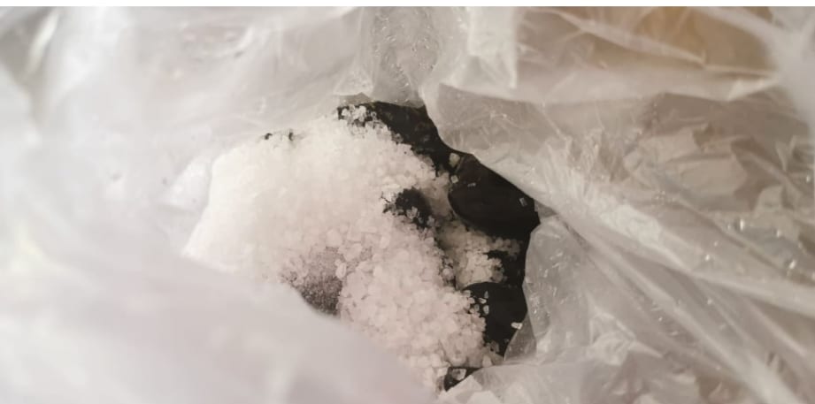 (Einige Miesmuscheln in einen Plastikbeutel geben, viel grobes Salz hinzufügen und ihn verschließen. Den verschlossenen Beutel in einen weiteren Beutel legen.