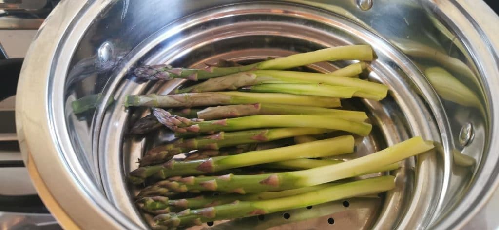 Bedecken Sie den Spargel mit der heißen Gemüsebrühe und setzen Sie das Kochen für etwa 20/30 Minuten bei schwacher Hitze fort, wobei Sie einen Deckel auf dem Topf halten.