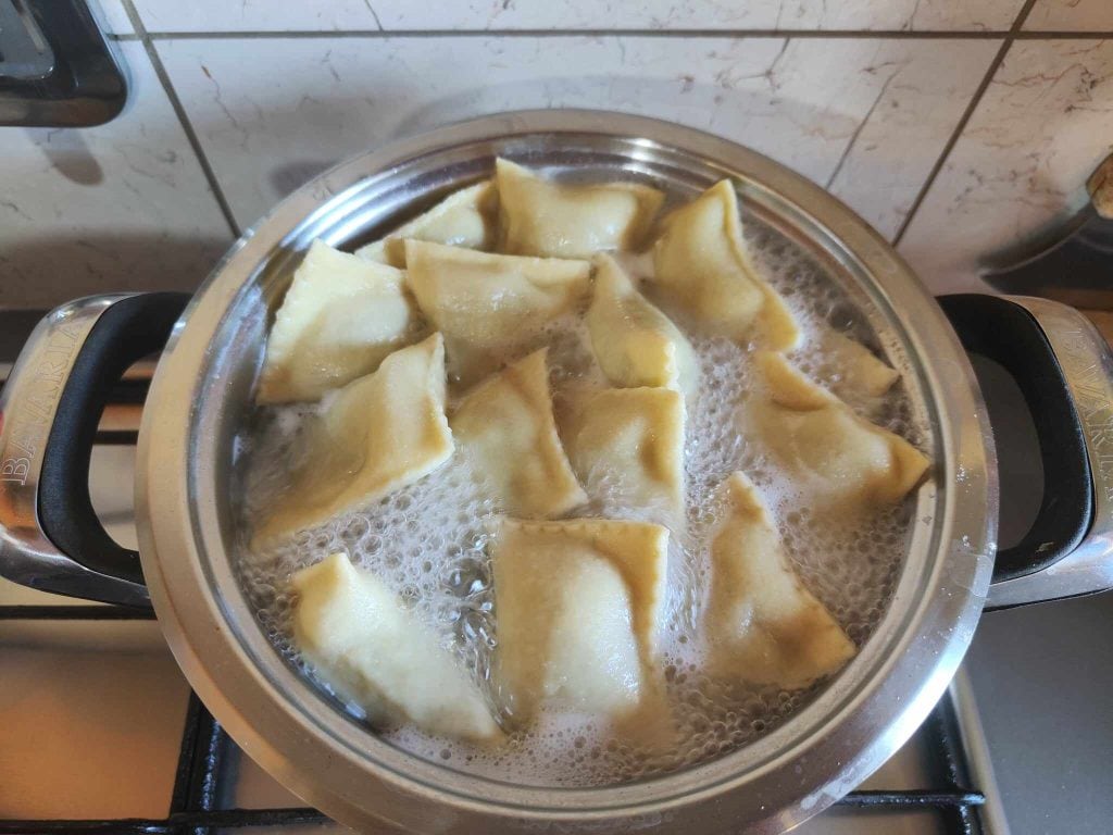 Fahre fort, bis die Füllung aufgebraucht ist (die Teigränder vor dem Austrocknen erneut kneten).