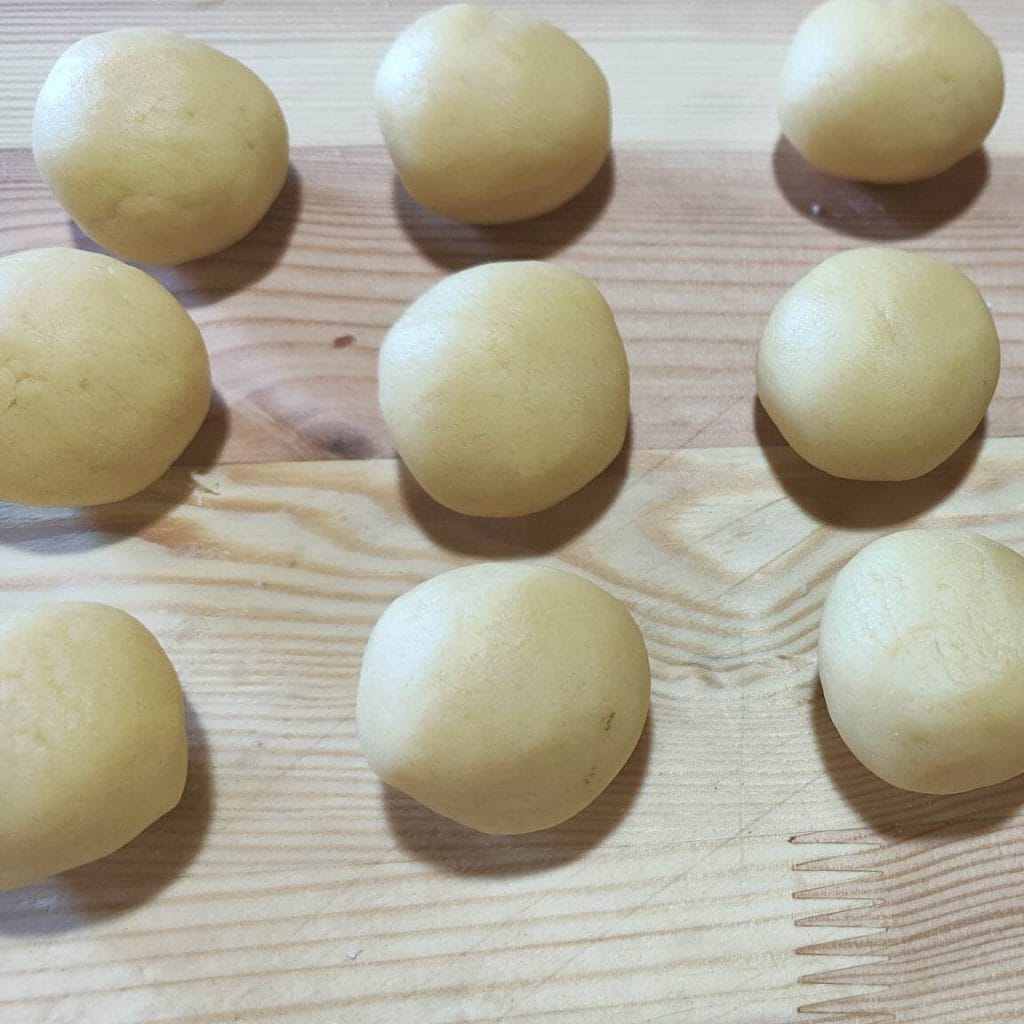 • Brechen Sie etwa 25 g große Stücke Teig ab, indem Sie eine Präzisionswaage verwenden (mit dieser Größe werden mittelgroße Pfirsiche entstehen, wenn Sie möchten, können Sie die Menge etwas erhöhen), formen Sie Kugeln und legen Sie sie auf ein mit Backpapier ausgelegtes Blech, wobei Sie darauf achten, einen Abstand von ein paar Zentimetern zwischen ihnen zu lassen.