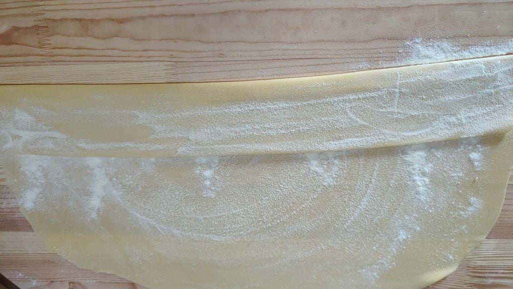 Sobald das Teigblatt fertig ist, bestäube die Oberfläche großzügig mit Mehl und rolle den Teig dann auf sich selbst auf. Schneide die Rolle in dünne Scheiben.