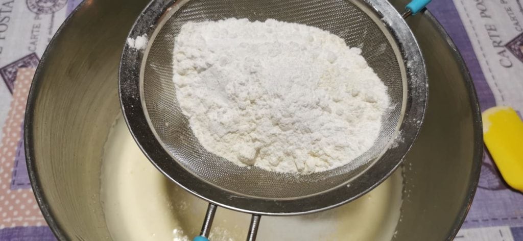 Wenn das Eiweiß steif geschlagen ist, können Sie die Eigelbe einzeln hinzufügen, damit die Mischung sie perfekt aufnehmen kann. Fügen Sie das letzte Eigelb hinzu und arbeiten Sie mit den Schneebesen weiter, bis die Mischung gut geschlagen ist. Eigelb auf dem geschlagenen Eiweiß. Jetzt ist es Zeit, die trockenen Zutaten hinzuzufügen, nämlich das Mehl 00 und die Kartoffelstärke. Beide Zutaten sollten gesiebt werden, um Klumpen zu vermeiden, die das Dessert ruinieren würden. Arbeiten Sie mit den Schneebesen weiter, um sie perfekt zu integrieren. Fügen Sie nun das Pflanzenöl in einem dünnen Strahl hinzu, damit es perfekt aufgenommen wird. Arbeiten Sie weiter mit den elektrischen Schneebesen, dabei die Geschwindigkeit reduzieren.