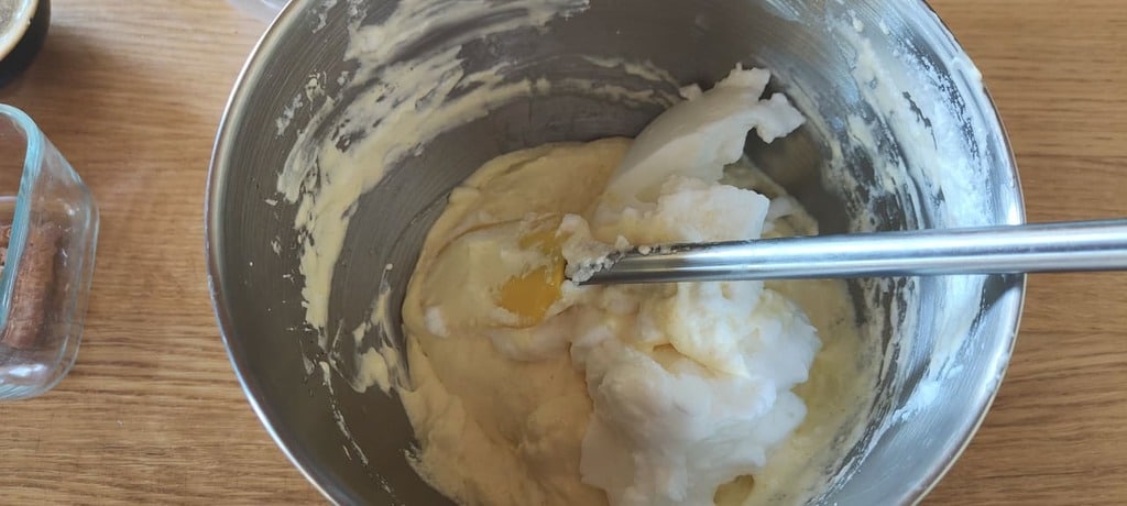 Das geschlagene Eiweiß zur Mascarpone-Ei-Creme geben und langsam und von unten nach oben umrühren, um zu vermeiden, dass die Mischung zusammenfällt.