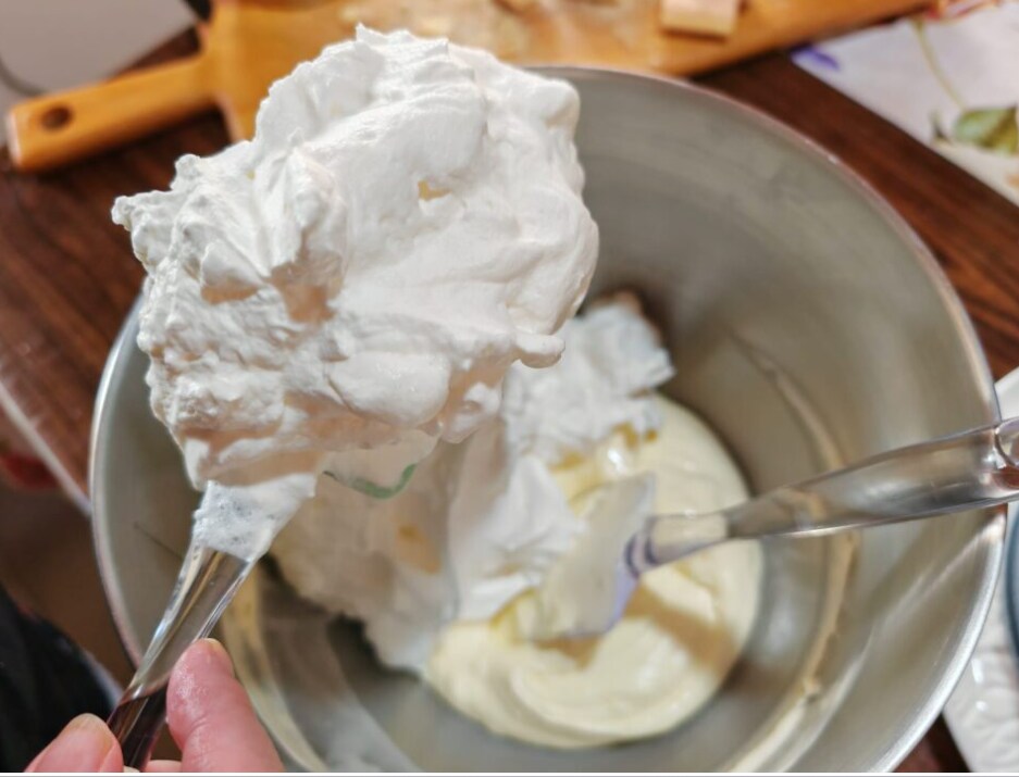 Die Eiweiße zur Mascarponecreme hinzufügen und mit einem Spatel vermischen.