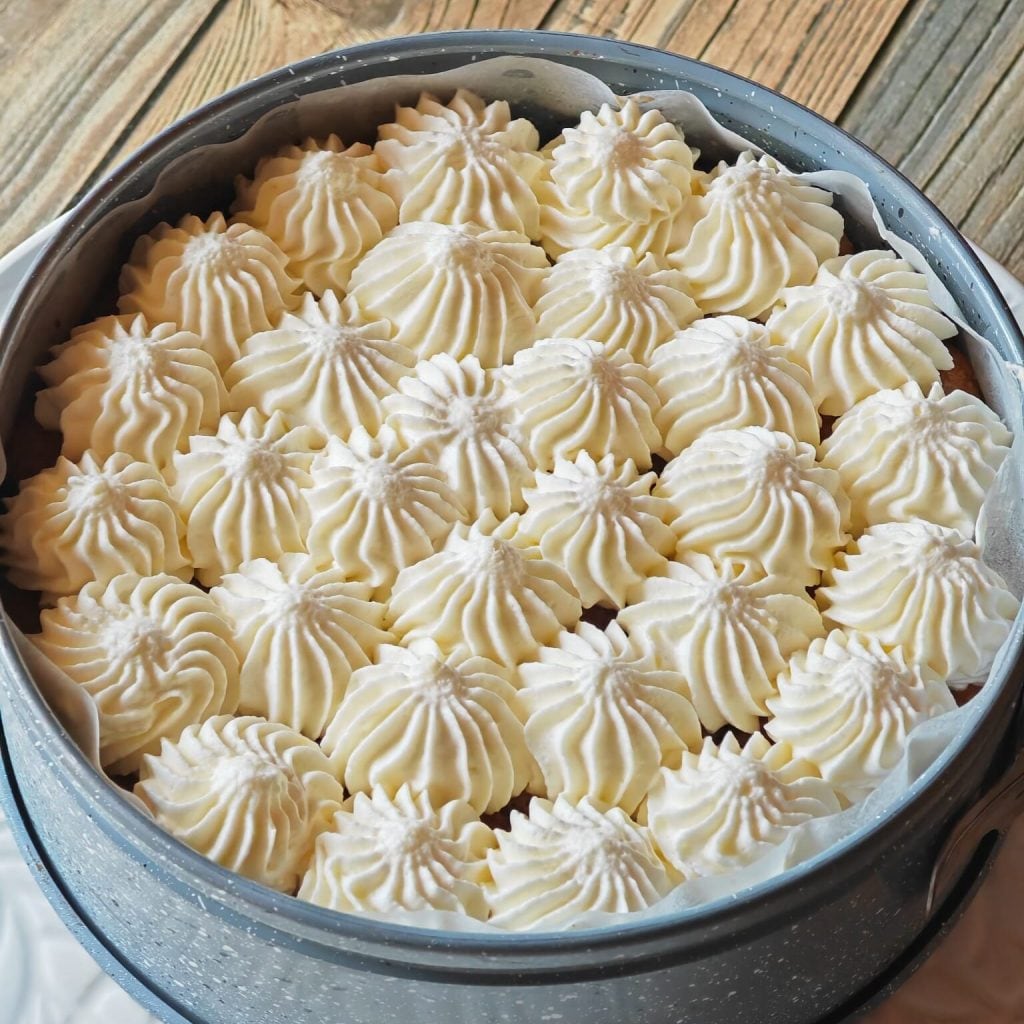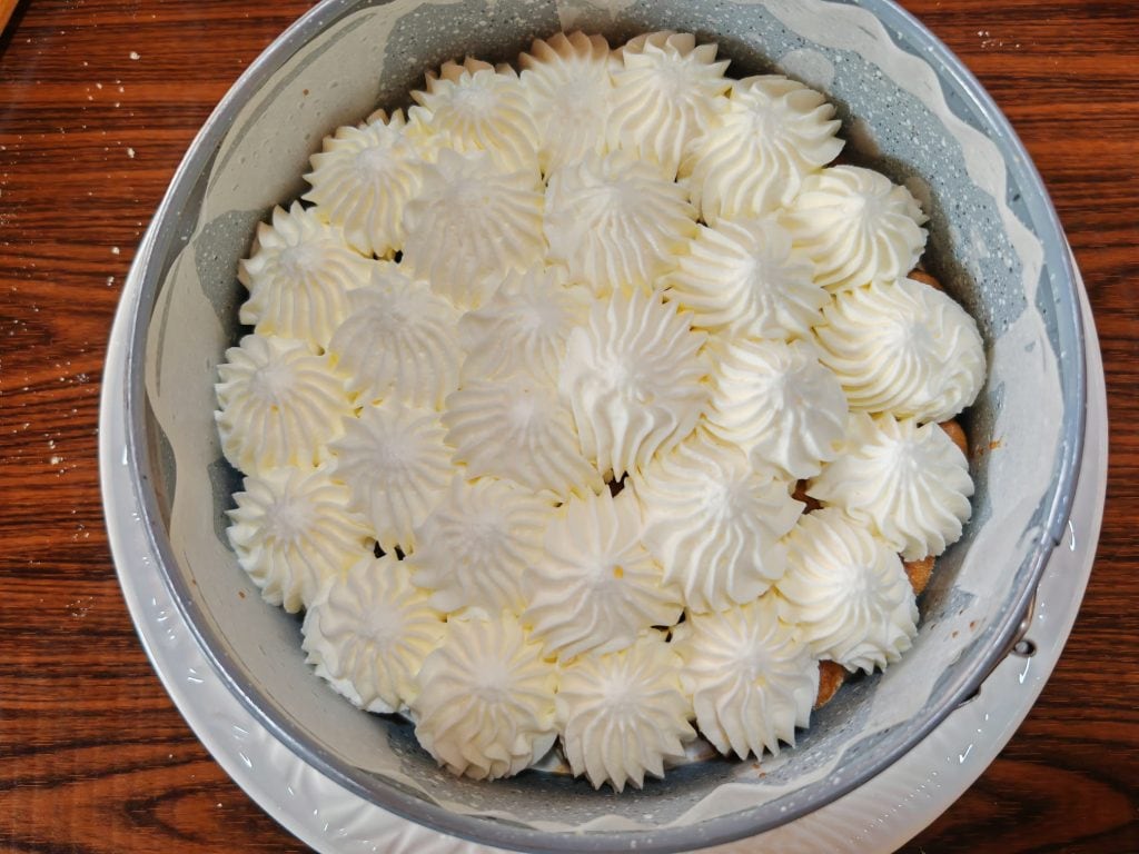 Mit der restlichen Creme bedecken. Wenn Sie möchten, können Sie diese in einen Spritzbeutel geben und dekorative Tupfen machen, wie ich es getan habe.