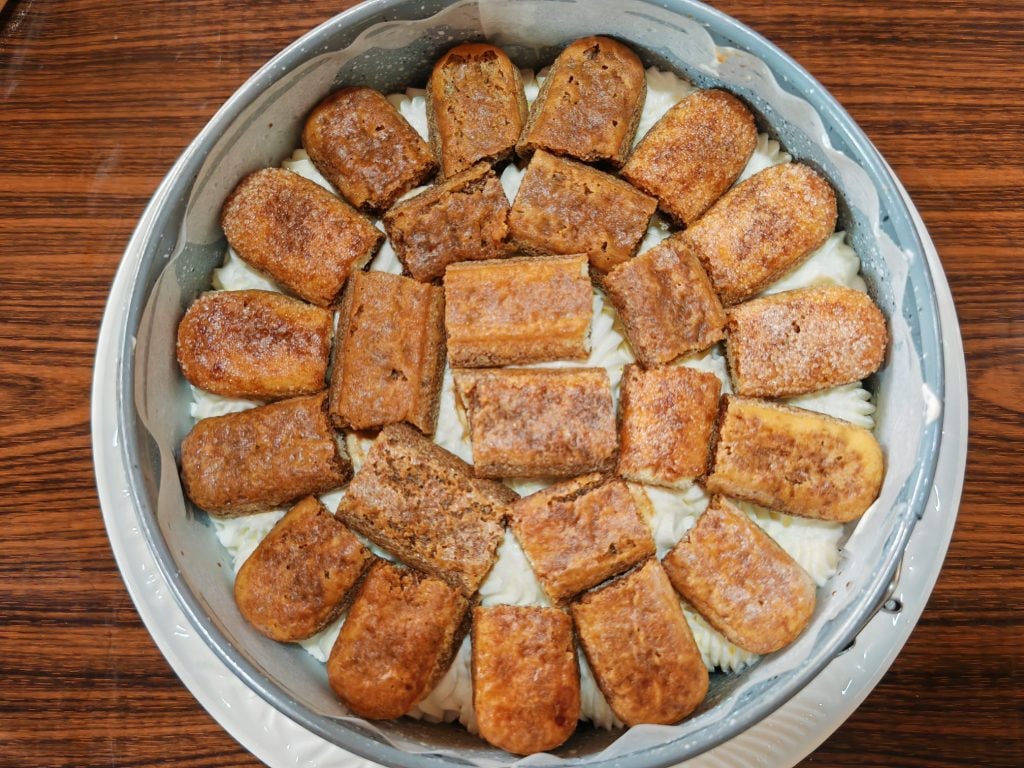 Die meisten Ihrer Löffelbiskuits halbieren, einige ganz lassen, die für den mittleren Teil benötigt werden.