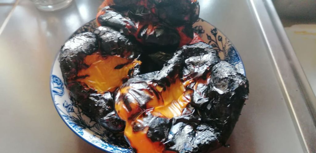10 Minuten warten, damit sich die geröstete Schale besser von der Frucht lösen lässt.
