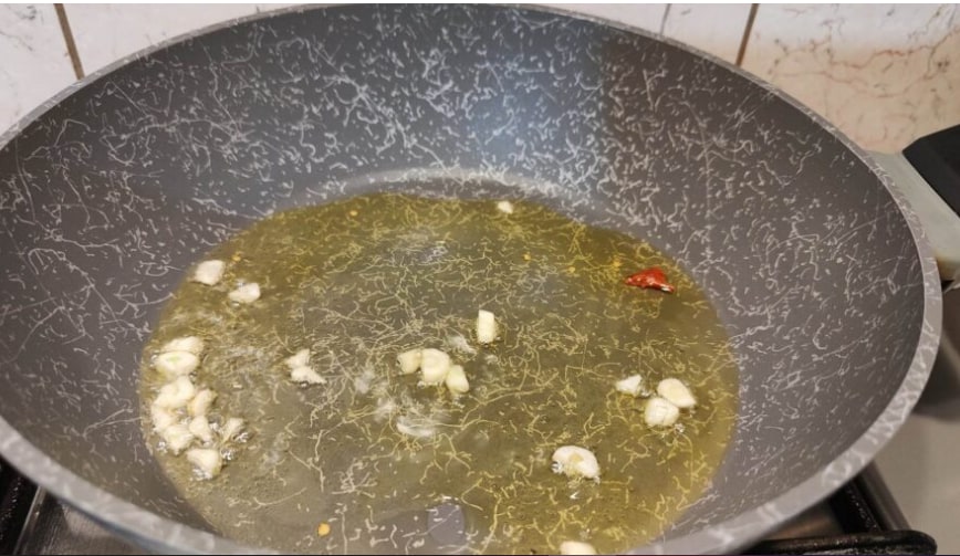 • In einer Pfanne 2 Knoblauchzehen mit 5 Esslöffeln Öl anbraten.