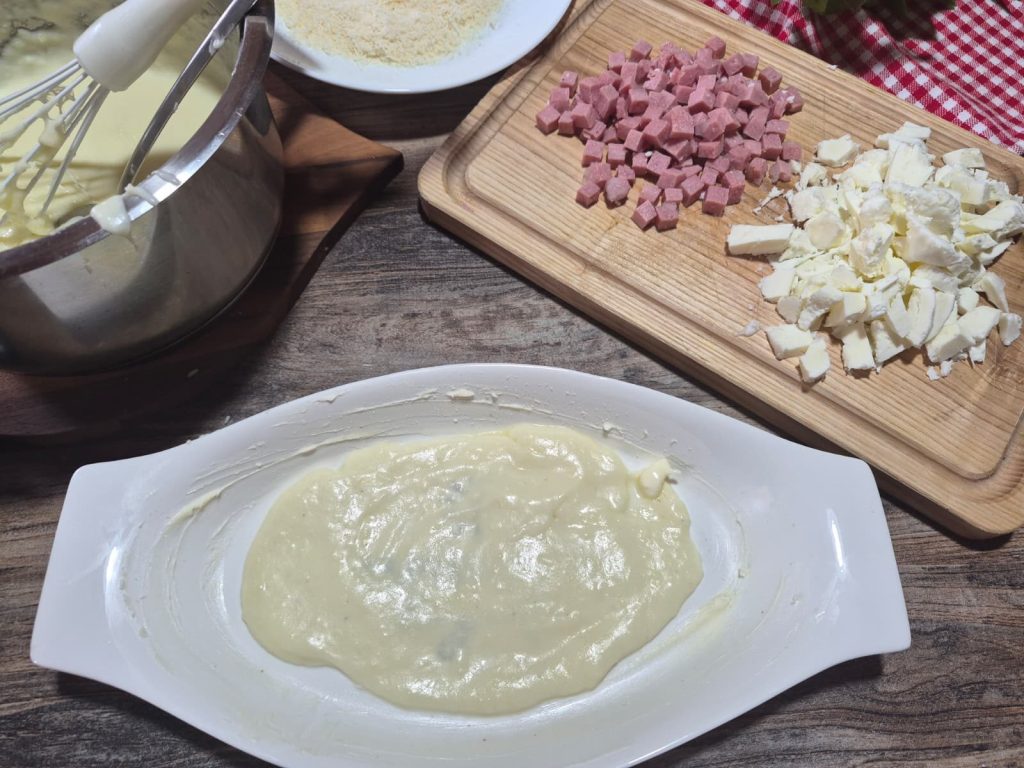 • Vermische in einer großen Schüssel die Tortellini, die heiße Béchamel, die Schinkenwürfel und die Hälfte der Mozzarella-Würfel.