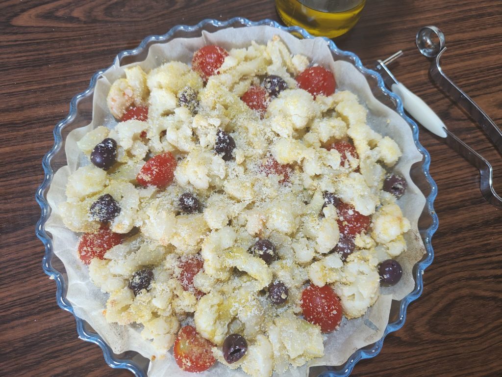 Mit einem Schuss Öl beträufeln und die gekochten Blumenkohlröschen verteilen, ohne sie zu sehr zu überlagern, die Kirschtomaten halbieren oder vierteln, je nach Größe, die Kapern, die Oliven und eine großzügige Prise getrockneten Oregano hinzufügen, zum Schluss salzen.