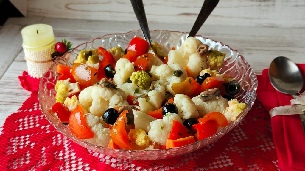 Es handelt sich um eine Beilage aus gekochtem Blumenkohl, gewürzt mit grünen Oliven, Essiggurken, süßen Papaccelle und schließlich in Öl eingelegten Sardellenfilets. Hinzu kommen Salz, Öl und Essig.