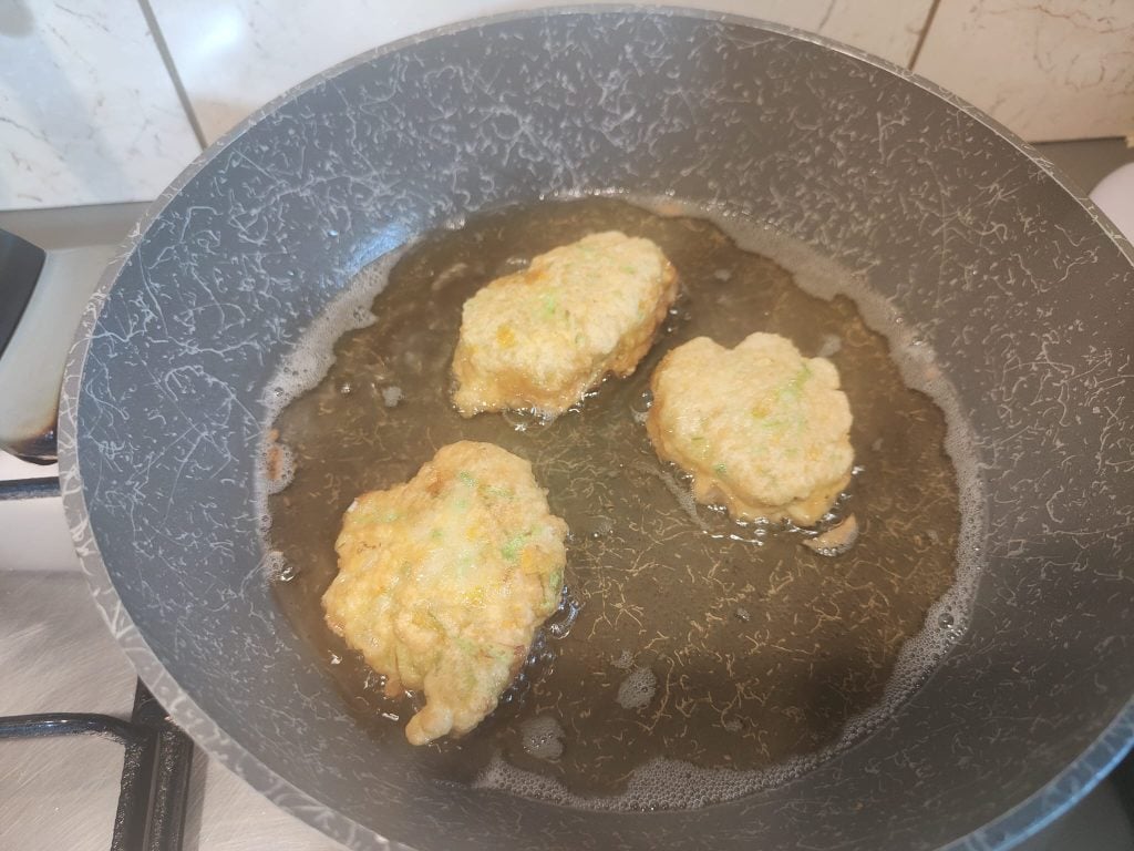 In der Zwischenzeit erhitzen Sie in einer großen Pfanne das Pflanzenöl und wenn es heiß ist, formen Sie mit zwei Löffeln Pfannkuchen und legen Sie sie in das heiße Öl.