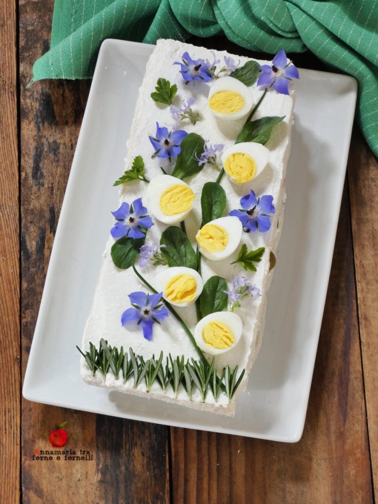 Mit der vierten Scheibe abdecken und dieses Mal nur die Käsemischung auftragen. Die Oberfläche mit 3 in Längsrichtung halbierten Wachteleiern, verschiedenen Kräutern und essbaren Blumen garnieren.