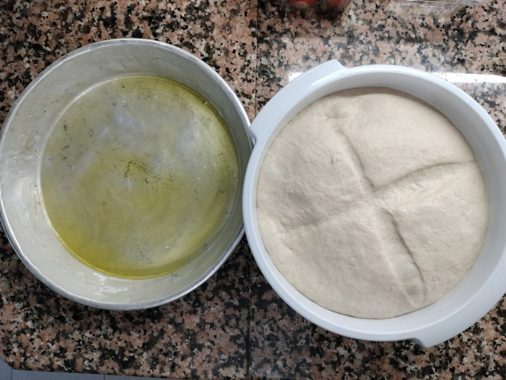 Der Teig ist ähnlich wie der der Focaccia aus Bari, jedoch ohne gekochte Kartoffeln. Ich habe zudem meinen schönen aktiven Sauerteig verwendet, der aufgefrischt wurde.