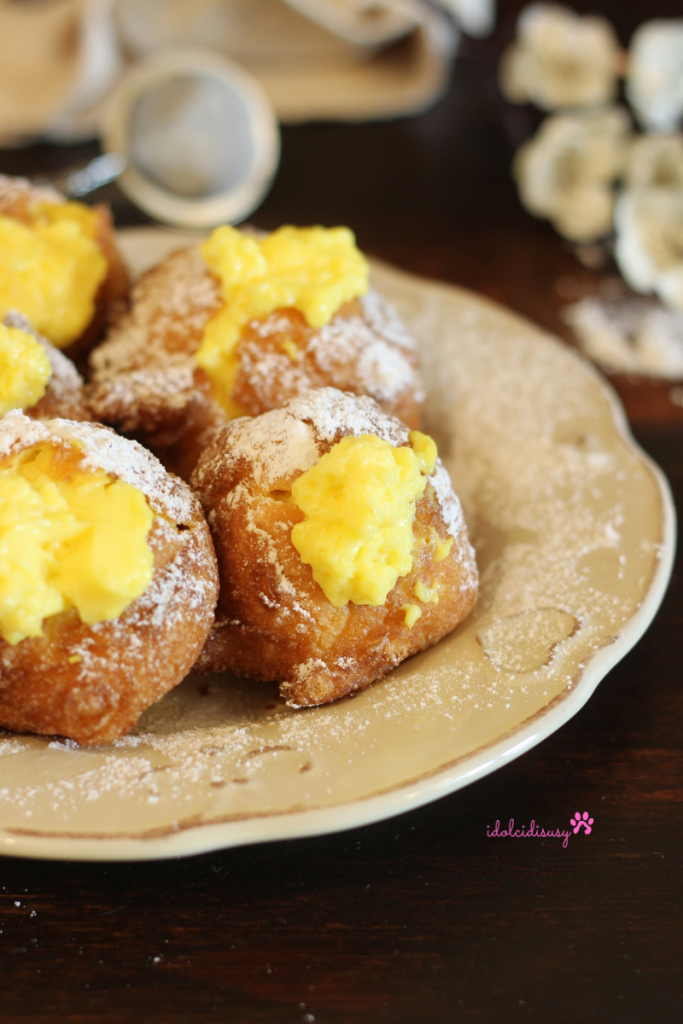 Es handelt sich um weiche Häppchen aus Brandteig, frittiert, luftig und leicht, die anschließend mit einer cremigen Vanille-Pâtissière (Crema pasticcera) gefüllt werden. Beim Reinbeißen sind sie unwiderstehlich: außen leicht knusprig und innen luftig, während die Creme jeden Bignè noch verführerischer macht.