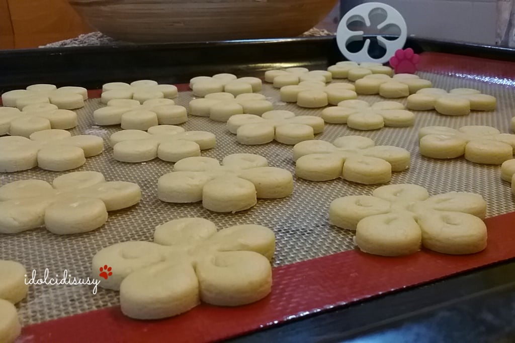 Nach der Ruhezeit rolle ich den Mürbeteig auf einer bemehlten Silikonmatte aus, forme meine Kekse mit einem Fiorellino-Ausstecher und backe sie bei 175°C für etwa 10-12 Minuten.