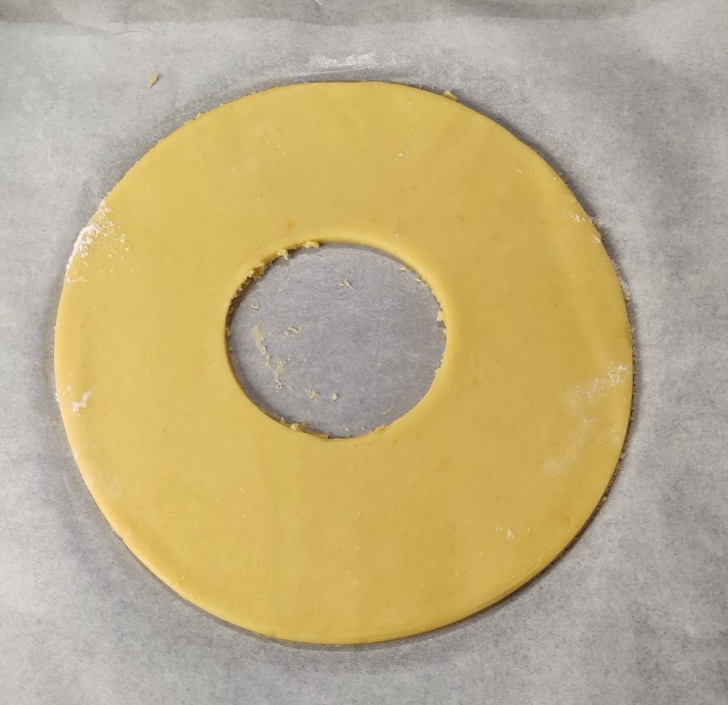 Nach der Ruhezeit im Kühlschrank nehme ich den Mürbeteig, lasse ihn ein wenig temperieren und teile ihn in zwei. Ich rolle die Teigstücke auf zwei Backpapierblättern auf 1 cm Dicke aus, mit einem Deckel oder einem 24 cm Tortenring forme ich zwei Kreise. In einem, mit einem 8 cm Ausstecher oder einem Glas, mache ich ein Loch in der Mitte. Ich übertrage die beiden Mürbeteigkreise auf das Backblech und lege sie für 30 Minuten in den Kühlschrank, dieser Schritt ist notwendig, damit sie beim Backen die Form nicht verlieren.
