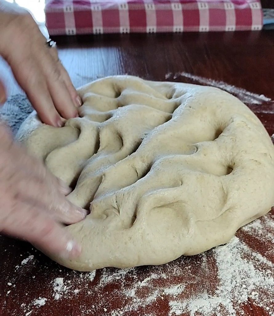 Dann gehe ich so vor, wie ich es mit der Bimby-Methode gemacht habe. Ich lege den Teig auf das leicht bemehlte Nudelbrett, bearbeite ihn ein wenig mit den Händen und mache die Verstärkungsfalten. Mit den Händen flachdrücke ich den Teig und falte ihn wie ein Briefumschlag, zuerst eine Seite und dann die andere, und forme die klassische Kugel. Den Teig lasse ich in einer mit Frischhaltefolie abgedeckten Schüssel gehen; er muss sein Volumen verdoppeln, das dauert etwa 5/6 Stunden.