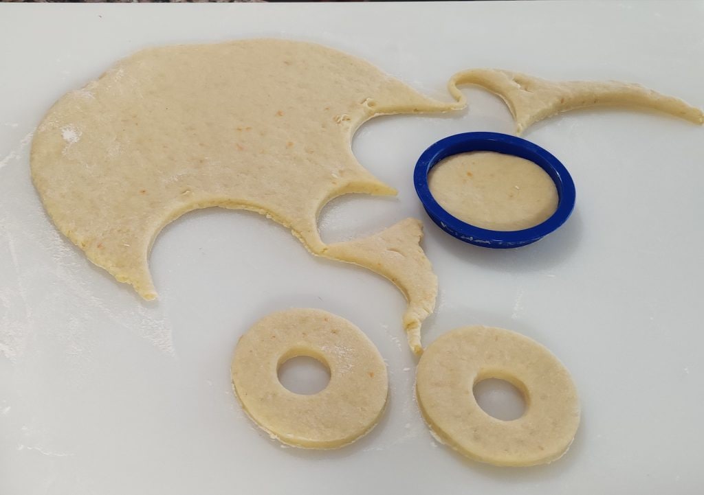 Auf einer leicht bemehlten Arbeitsfläche rolle ich den Teig mit einem Nudelholz auf eine Dicke von etwa 1 cm aus. Mit einem 7 cm großen Ausstecher forme ich die Scheiben für die Kringel und schneide mit einem kleineren Ausstecher die Mitte aus.