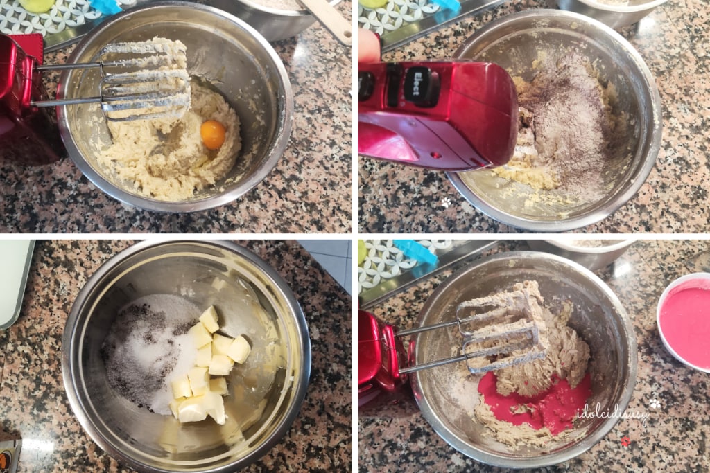 Ich gebe die Lebensmittelfarbe in die Buttermilch und mische sie gut. Dann füge ich der Buttermasse bei mittlerer Geschwindigkeit die Buttermilch und das Mehl mit dem Kakao hinzu, abwechselnd, gut mischen, ohne die Masse zu stark zu bearbeiten.