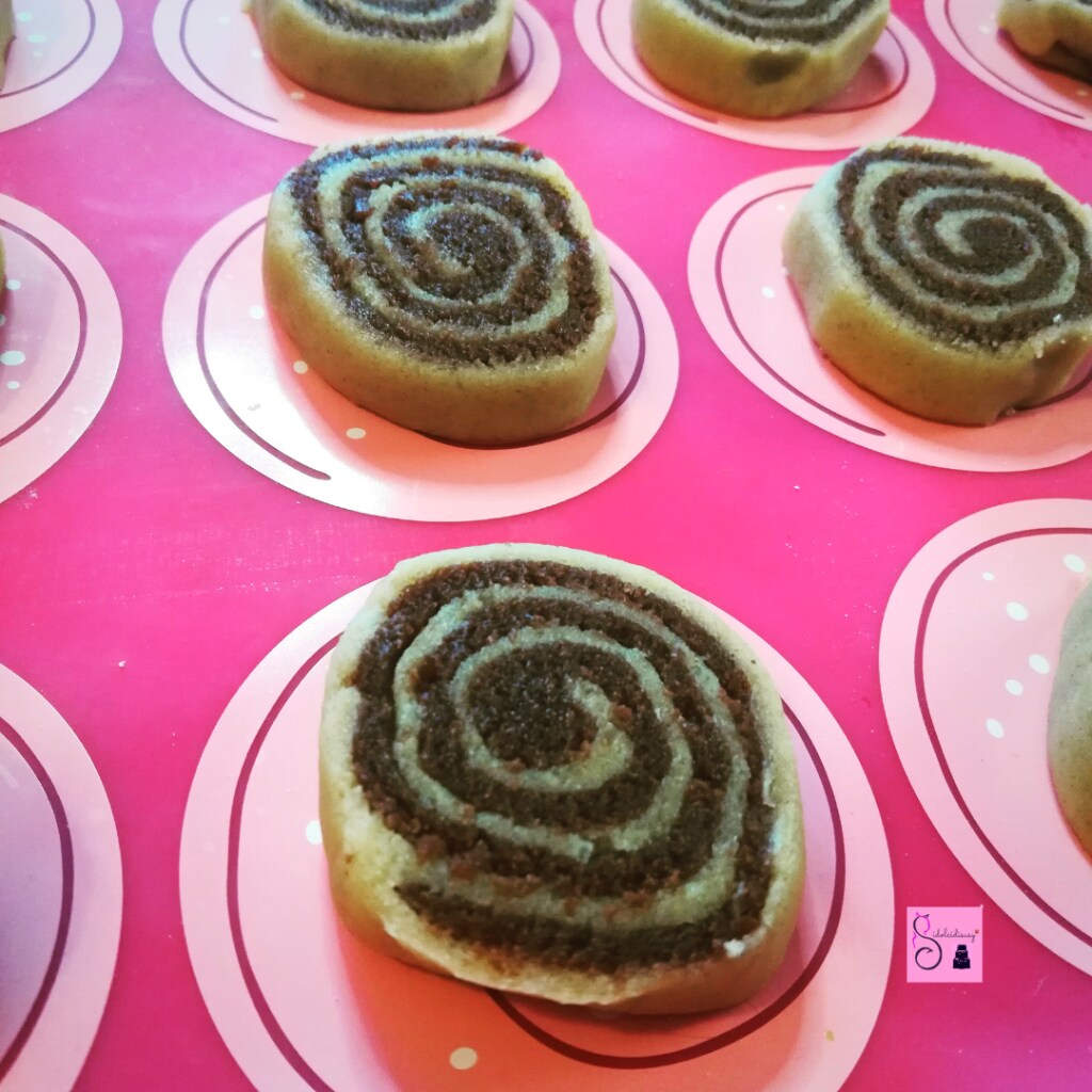 Dann lege ich das Kakaoblatt auf das weiße und rolle sie zusammen auf. Anschließend schneide ich die Rolle in 1 cm dicke Scheiben und lege sie auf ein mit Backpapier ausgelegtes Blech.
