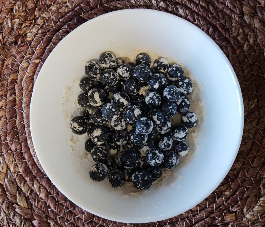 Bevor ich anfange, wasche und trockne ich die Blaubeeren. Mehr als die Hälfte mehle ich leicht ein, damit sie nicht auf den Boden des Pflaumenkuchens sinken, den Rest lege ich beiseite, um die Oberfläche zu dekorieren.