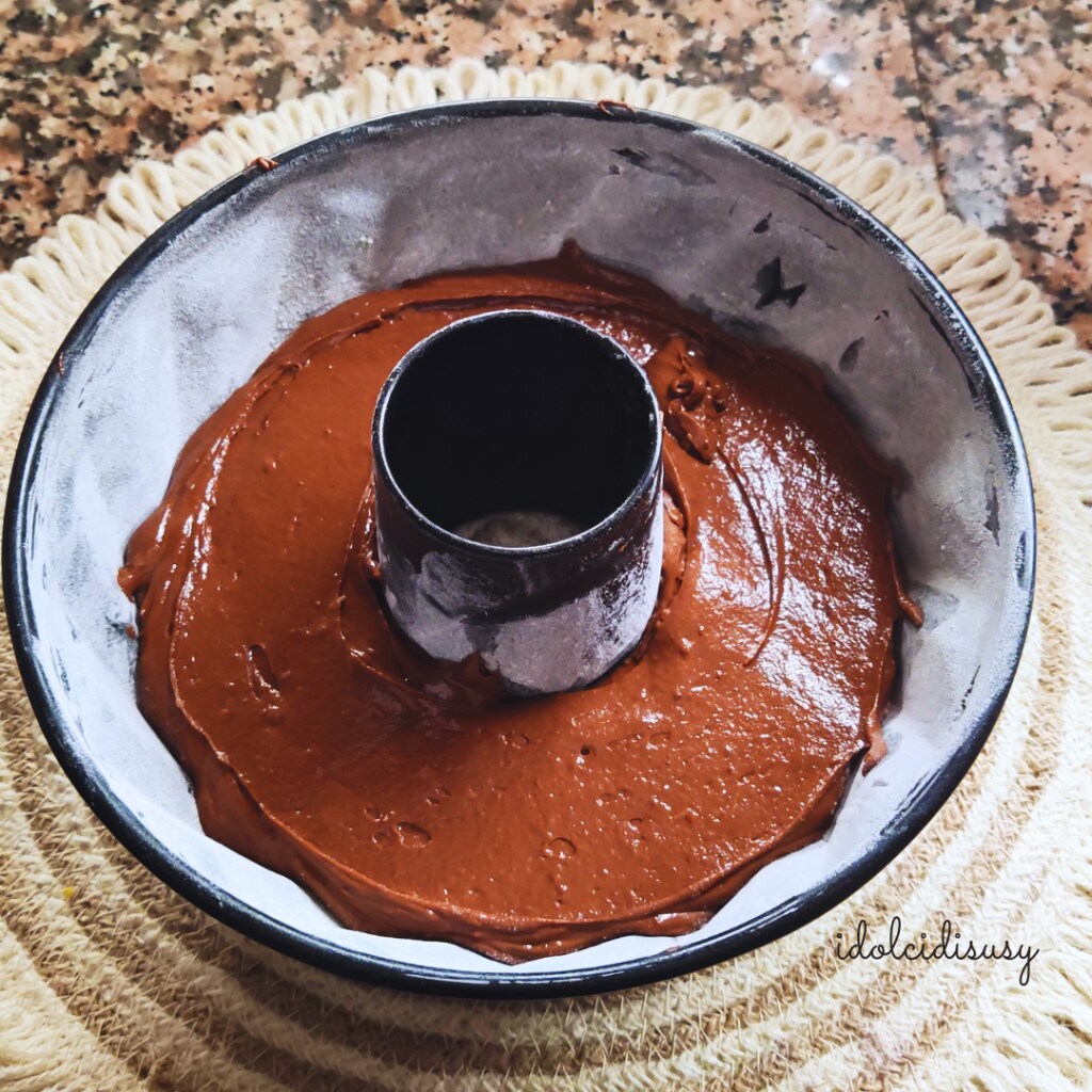 3. In einer Schüssel Mehl, Kakao und Backpulver zusammen sieben. Nach und nach zur Mischung hinzufügen und auf niedriger Geschwindigkeit mixen, bis ein glatter und homogener Teig entsteht.4. Die Gugelhupfform einfetten und mit Mehl bestäuben, den Teig hineingeben und im statischen Ofen bei 180° für etwa 35-40 Minuten backen. Die Stäbchenprobe bestätigt die Garung.
