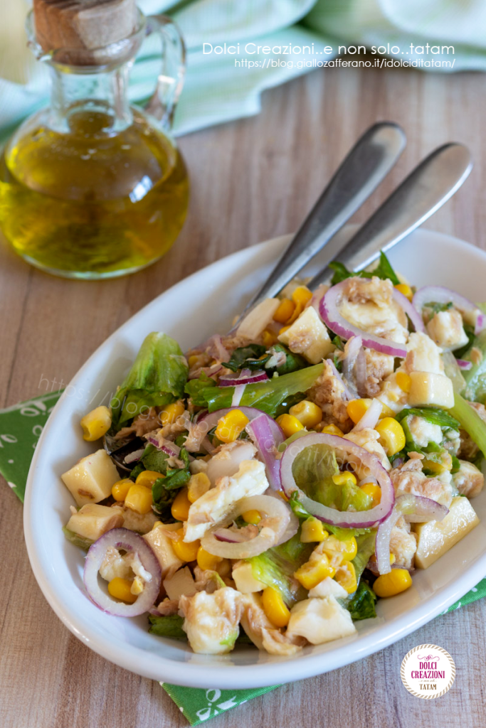 Sommerlicher Salat mit Mais und Thunfisch, ein Rezept, das schnell und lecker ist, in wenigen Minuten zubereitet wird und allen schmecken wird.