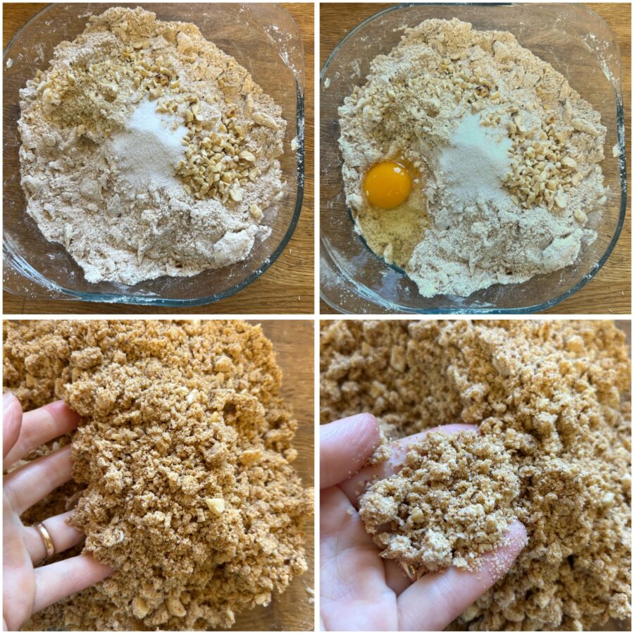 Mit den Händen schnell arbeiten, bis eine krümelige Masse entsteht. Die gehackten Mandeln oder Haselnüsse untermischen – das ist optional, gibt aber extra Knusprigkeit und Aroma.