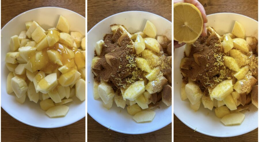 Honig, Zimt und Vollrohrzucker (oder normalen Zucker) hinzufügen, ein paar Esslöffel Zitronensaft, die abgeriebene Schale (nur wenn die Zitrone Bio ist) und die Semmelbrösel.