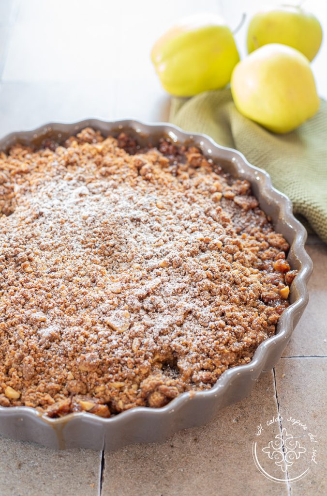 Es handelt sich um ein Dessert aus aromatischen, saftigen Äpfeln, bedeckt mit einer knusprig-griesigen Kruste aus Mürbeteig, die an eine Sbrisolona erinnert.