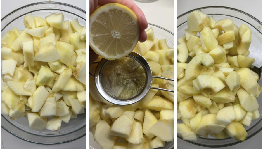 • Äpfel waschen, schälen und das Kerngehäuse entfernen. In kleine Stücke schneiden und in eine Schüssel geben,