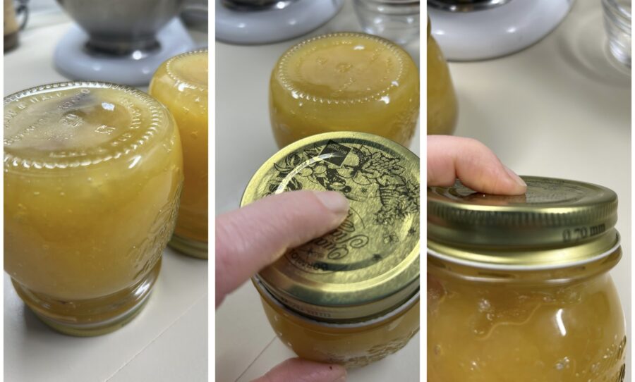 • Sofort mit heißer Konfitüre bis zum Rand füllen (vorsichtig, um Verbrühungen zu vermeiden), sehr fest verschließen und die Gläser auf den Kopf stellen, bis sich ein Vakuum gebildet hat und die Mitte des Deckels nach innen gedrückt bleibt. Wenn ihr unsicher seid, ob alles keimfrei gearbeitet wurde, um mögliche Kontaminationen zu vermeiden, stellt die Gläser erneut in den Topf, bedeckt sie mit lauwarmem Wasser und lasst sie etwa zehn Minuten kochen. Anschließend im Wasser abkühlen lassen, um Temperaturschocks zu vermeiden, dann herausnehmen und das Vakuum prüfen.
