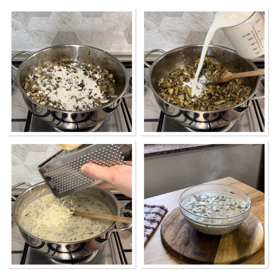 • Wenn die Flüssigkeit der Pilze verdampft ist, nehmt den Knoblauch heraus und gebt das Mehl hinzu. Rührt bei starker Hitze um und gießt dann nach und nach die Milch hinzu, dabei ständig rühren. Am Ende erhaltet ihr eine cremige Pilz-Béchamel, die nicht zu fest sein sollte; wirkt sie zu dick, gebt noch etwas Milch hinzu. Bedenkt, dass die Sauce beim Abkühlen noch etwas fester wird als am Ende der Kochzeit. Gebt den geriebenen Käse dazu, rührt um, füllt die Sauce in eine Schüssel und lasst sie abkühlen.