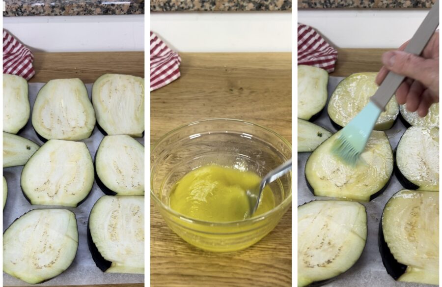 Legt die Scheiben auf ein mit Backpapier ausgelegtes Backblech, bereitet eine Emulsion aus Öl und Wasser zu, indem ihr sie mit einer Gabel verquirlt, und bepinselt damit die Oberfläche der Auberginen. Backt sie in einem vorgeheizten Ofen bei 200°C, besser ohne Umluft, für 10 Minuten.