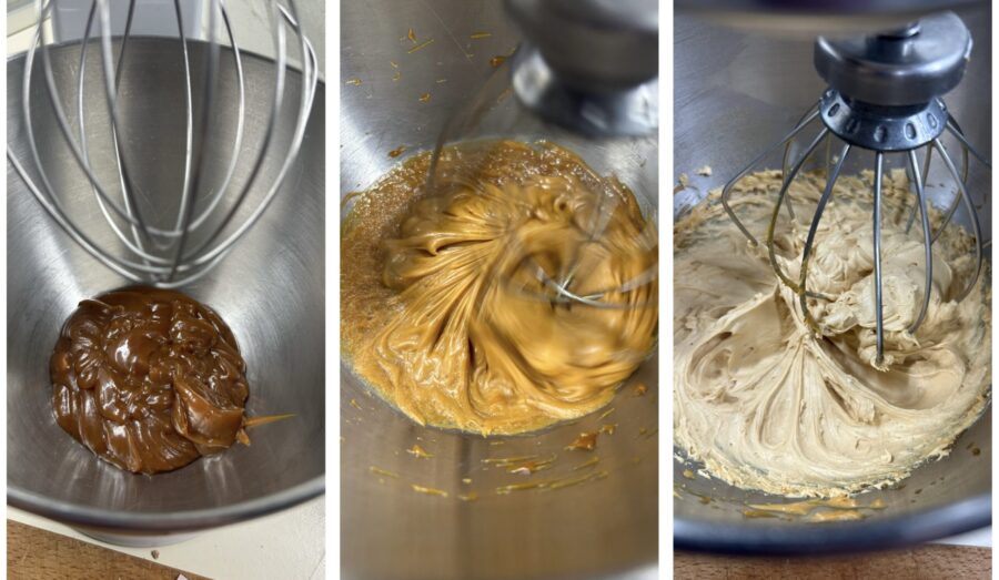 • Stellt auch die Rührschüssel der Küchenmaschine in den Kühlschrank, dann gebt die Sauce in die kalte Schüssel und beginnt zu schlagen, bis eine feste und leichte Masse entsteht (etwa 15 Minuten). Das aufgeschlagene Salzkaramell ist nun bereit, unsere Desserts zu füllen und zu dekorieren.