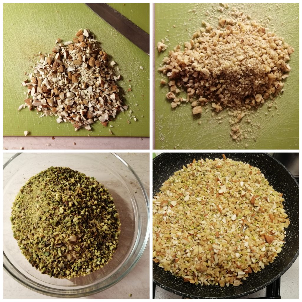 • Hackt die Walnusskerne und die Mandeln mit dem Messer, mischt sie mit den Pistazienstückchen und röstet alles kurz in einer Pfanne für ein paar Minuten. Häufig umrühren und nicht anbrennen lassen.