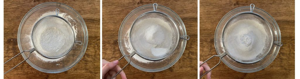 In einer separaten Schüssel Mehl, Zucker und Backpulver durchsieben. Sie können den Zucker durch 60 g Erythrit ersetzen oder nach Geschmack Stevia verwenden, um zuckerfreie Pancakes zu erhalten.