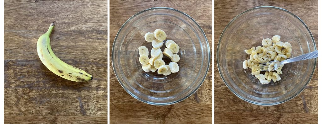 Für die Bananen-Pancakes die reife Banane in Scheiben schneiden und in eine Schüssel geben. Mit einer Gabel zerdrücken, bis eine gleichmäßige Masse entsteht.