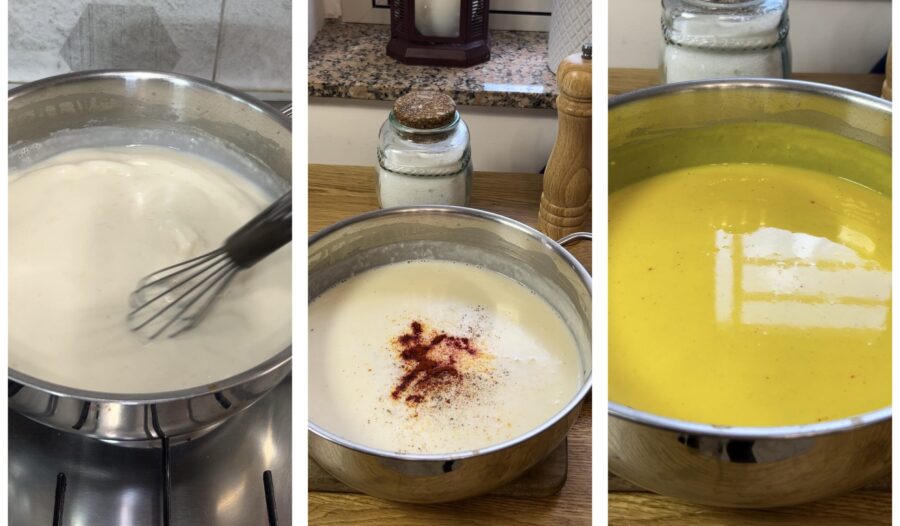 Die Safran-Béchamel ist nun einsatzbereit. Sobald sie abgekühlt ist, kann sie zu dick werden; in diesem Fall mit etwas Milch verdünnen. Falls ihr sie fester benötigt, etwas Mehl in wenig Wasser auflösen, unterrühren und erneut auf dem Herd erhitzen, bis die gewünschte Konsistenz erreicht ist.
