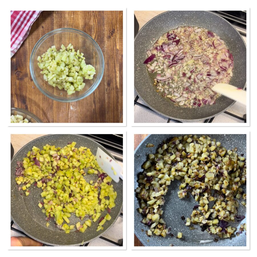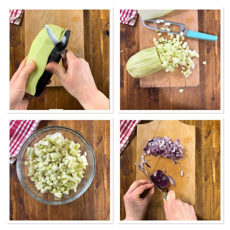 Die Aubergine schälen und in sehr kleine Würfel schneiden, in eine Schüssel geben, etwas Salz hinzufügen, umrühren und beiseitestellen. Die Zwiebel hacken und in etwas Öl anschwitzen.