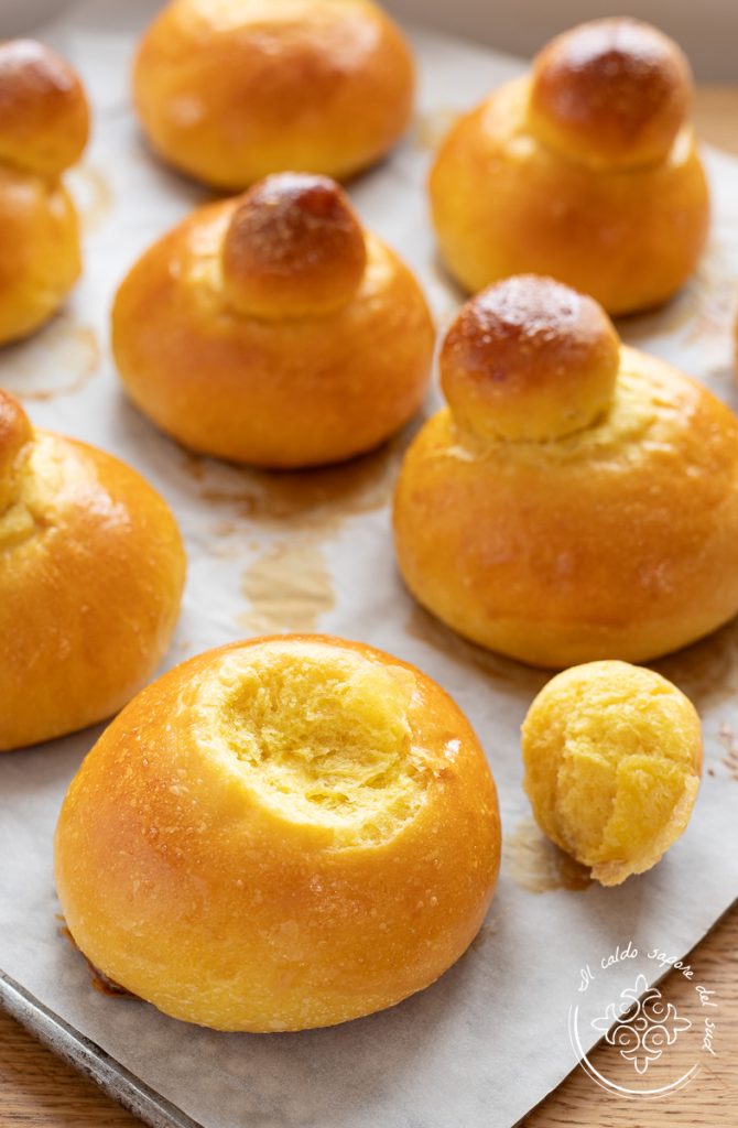 Brioche mit Tuppo und Safran ohne Schmalz und Butter, aber auch Brioche mit Tuppo ohne Ei. Wenn ihr nach dem originalen Rezept der Brioches col Tuppo sucht, muss ich euch enttäuschen: das gibt es nicht. In meinem langen Leben als Sizilianerin, aufgewachsen mit Mandel-Granita und Brioches mit Tuppo, kann ich euch mit Sicherheit sagen, dass ich nie zwei gleiche Brioches gegessen habe: mal waren sie sehr gut, mal weniger, aber nie identisch. Im Laufe der Jahre habe ich jedoch verschiedene Rezepte ausprobiert, und einige davon haben mich nie enttäuscht. Daher möchte ich euch heute eine etwas außergewöhnliche Version der Brioche mit Tuppo und Safran vorstellen: ohne Ei, Schmalz oder Butter, und trotzdem