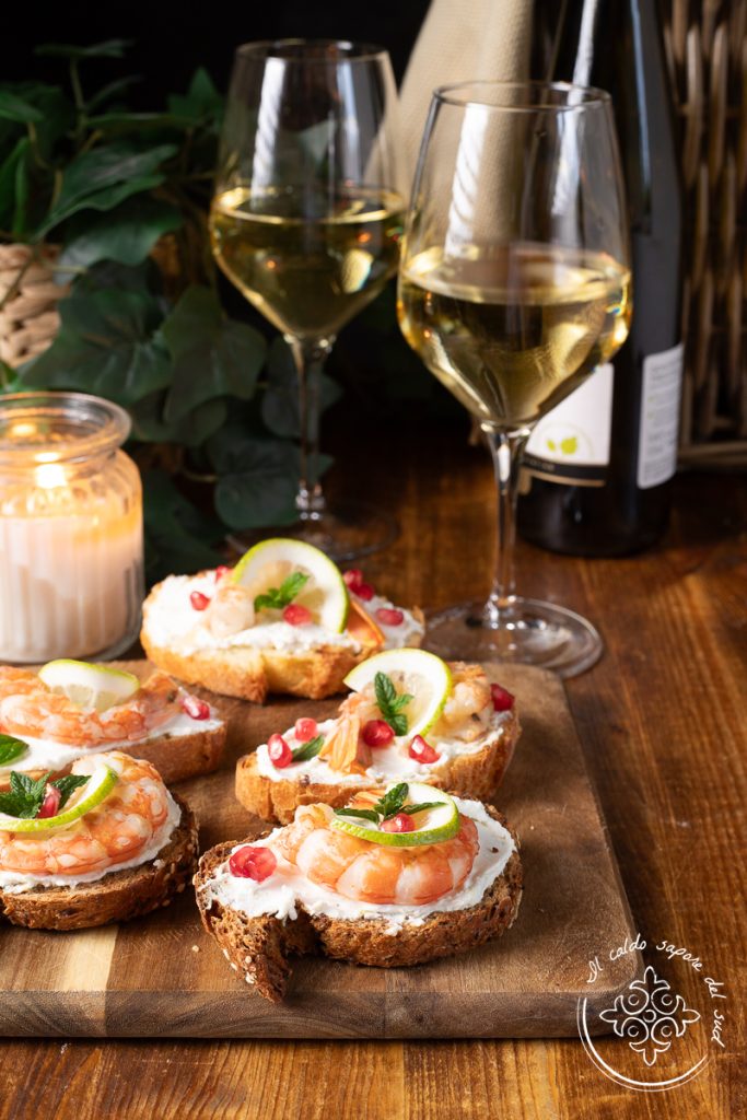 Bruschetta mit Robiola und Garnelen, eine perfekte Vorspeise für jede Gelegenheit, vom Stehbuffet bis zum Aperitif, ideal zu Weihnachten und Silvester und immer köstlich. Einfach, farbenfroh, eindrucksvoll — die Bruschetta mit Mehrkornbrot und Garnelen sind die richtige Idee, wenn man eine schnelle, schicke und gourmetartige Vorspeise zubereiten möchte. Ihr könnt diese Bruschetta auch mit normalem Brot, kleinen Garnelen oder frischen bzw. aufgetauten Garnelen zubereiten. Die Robiola hingegen, mit ihrem frischen und zarten Geschmack, empfehle ich nicht zu ersetzen; sie macht euer Gericht wirklich besonders. Diese Bruschetta mit Garnelen sind köstlich, wenn ihr eure Gäste beeindrucken wollt und sind die richtige Idee für den Silvester-Toast, vor allem in Kombination mit einem guten Prosecco! Seid ihr also bereit, euer Festtagsmenü mit Fisch mit diesen schmackhaften Bruschetta und einem guten Glas Weißwein zu vervollständigen? Ab in die Küche — aber bevor wir ans Kochen gehen, erinnere ich euch daran: Wenn ihr über alle meine Rezepte auf dem Laufenden bleiben wollt, könnt ihr meiner Facebook-Seite (hier) und meinem Instagram-Profil (hier) folgen.