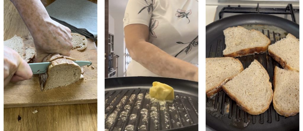 Schneidet das Brot in etwa 1 cm dicke Scheiben. Butter direkt in der Pfanne schmelzen, die Brotscheiben hineinlegen und von beiden Seiten goldbraun anbraten.