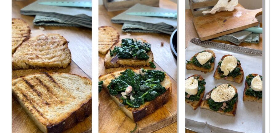 Belegt jede Scheibe mit etwas Spinat, legt die Mozzarella-Scheiben darauf, gebt etwas Pfeffer darüber und gebt die Brote für 5–7 Minuten in einen vorgeheizten Backofen bei 200°C, gerade solange, bis die Mozzarella schmilzt.
